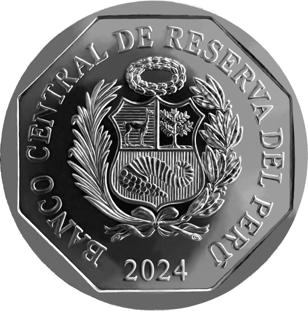 El anverso de la moneda mantiene el diseño tradicional con el Escudo de Armas del Perú en el centro, rodeado por la inscripción “BANCO CENTRAL DE RESERVA DEL PERÚ” y el año de acuñación.