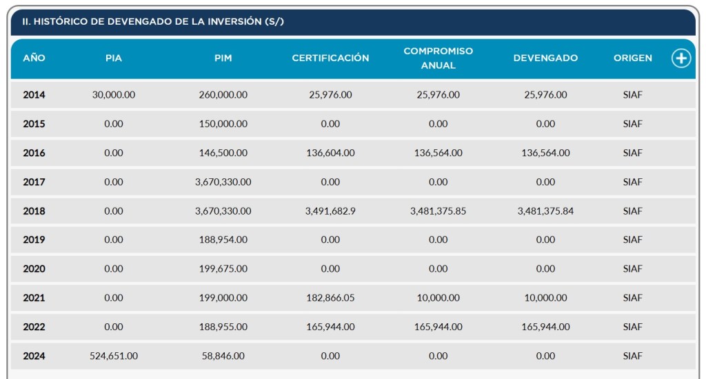La supervisión, por 53,565.46, recién se iniciará el 20 de agosto de 2026 y culminará el 27 de agosto de 2027. El PIM para el 2024 registraba 58,846 soles y hasta diciembre el avance era de 0.0%.