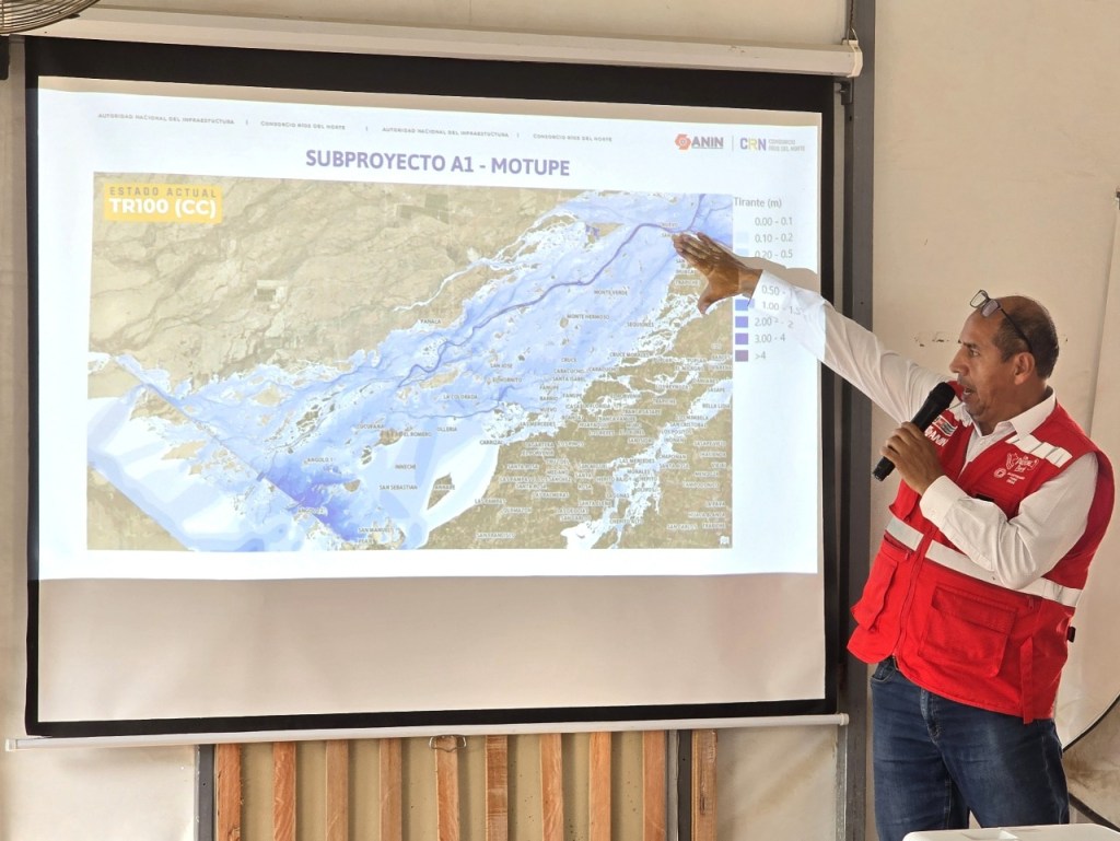 La Autoridad Nacional de Infraestructura (ANIN) y la Mancomunidad Municipal del Valle La Leche (MMUVALL) realizaron una reunión conjunta para exponer los avances del Proyecto de Defensas Ribereñas de los Ríos Motupe y La Leche. Durante el encuentro, el alcalde de Íllimo y presidente de la MMUVALL, Juan Pablo Santa María, destacó que, a pesar de las recientes precipitaciones y eventos climáticos registrados en la zona, las defensas ribereñas no sufrieron daños, evidenciando la solidez y la resistencia de la infraestructura en construcción.