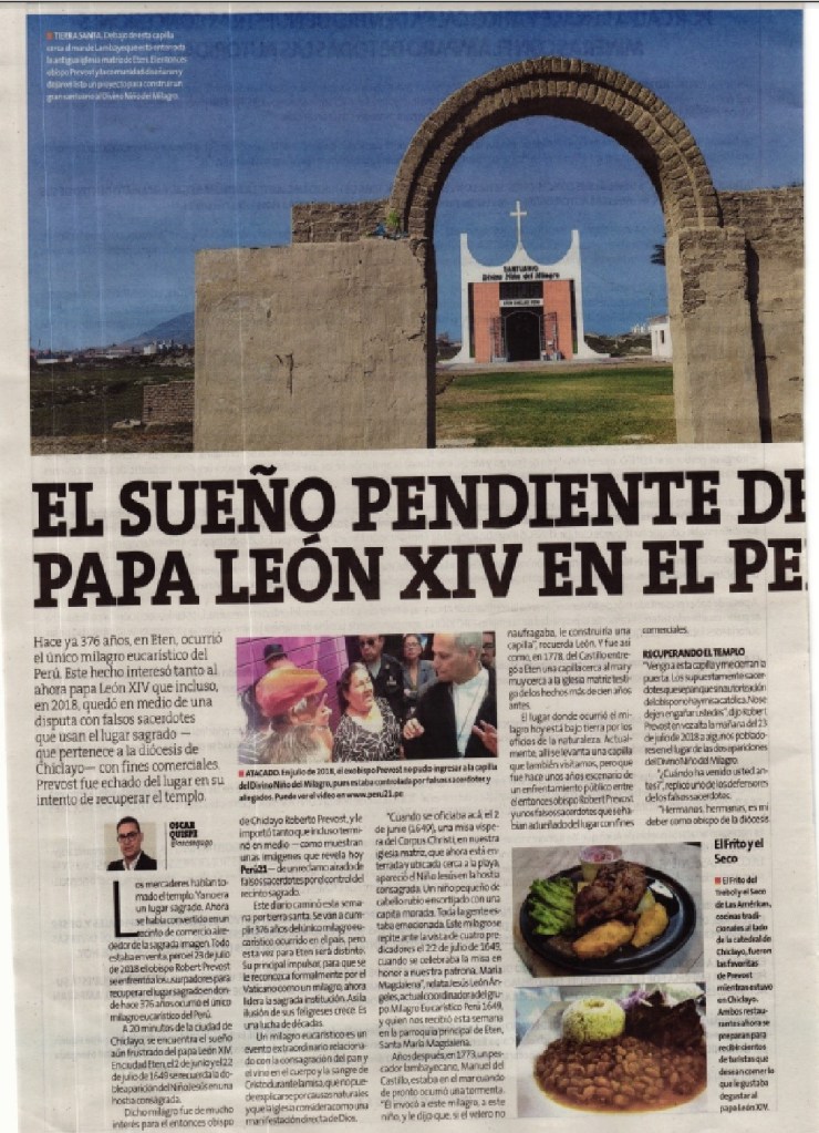Hace ya 376 años, en Eten, ocurrió el único milagro eucarístico del Perú. Este hecho interesó tanto al ahora papa León XIV que incluso, en 2018, quedó en medio de una disputa con falsos sacerdotes que usan el lugar sagrado —que pertenece a la diócesis de Chiclayo— con fines comerciales. Prevost fue echado del lugar en su intento de recuperar el templo.