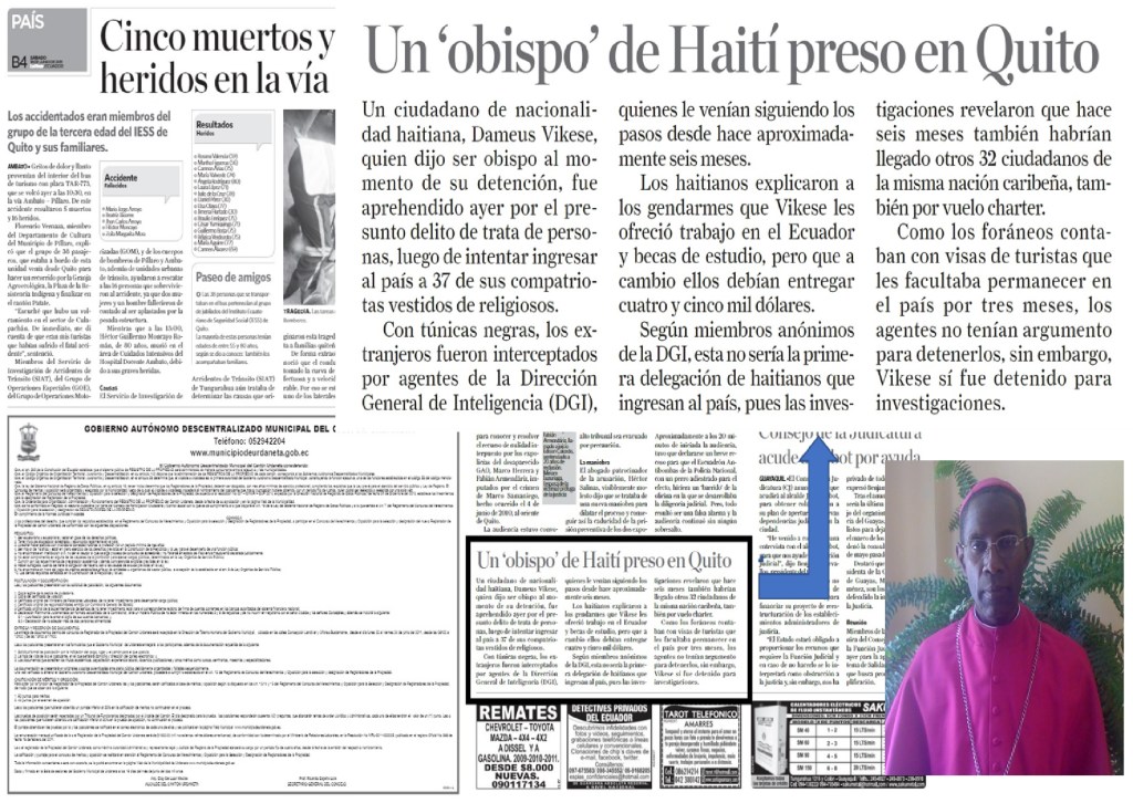 En el libro “Migración haitiana hacia el sur andino” (2017) publicado por el Observatorio Iberoamericano sobre Movilidad Humana, Migraciones y Desarrollo (OBIMID), con la Universidad Jesuita Antonio Ruiz de Montoya, en su página 36, se consigna: “Se ha podido evidenciar una profunda imbricación entre iglesias denominadas evangélicas y migración haitiana; algunas personas ecuatorianas, miembros de éstas, han acogido en sus casas a personas haitianas en tránsito. Como evidencia de un caso concreto que salió a la luz en junio de 2011, el haitiano Dameus Vikese fue detenido al hacerse llamar obispo y estafar a sus compatriotas al “cobrarles cuatro mil dólares a cada uno, ofreciéndoles trabajo, vivienda y estudios en Ecuador”, pero al llegar les abandonaba a su suerte”.