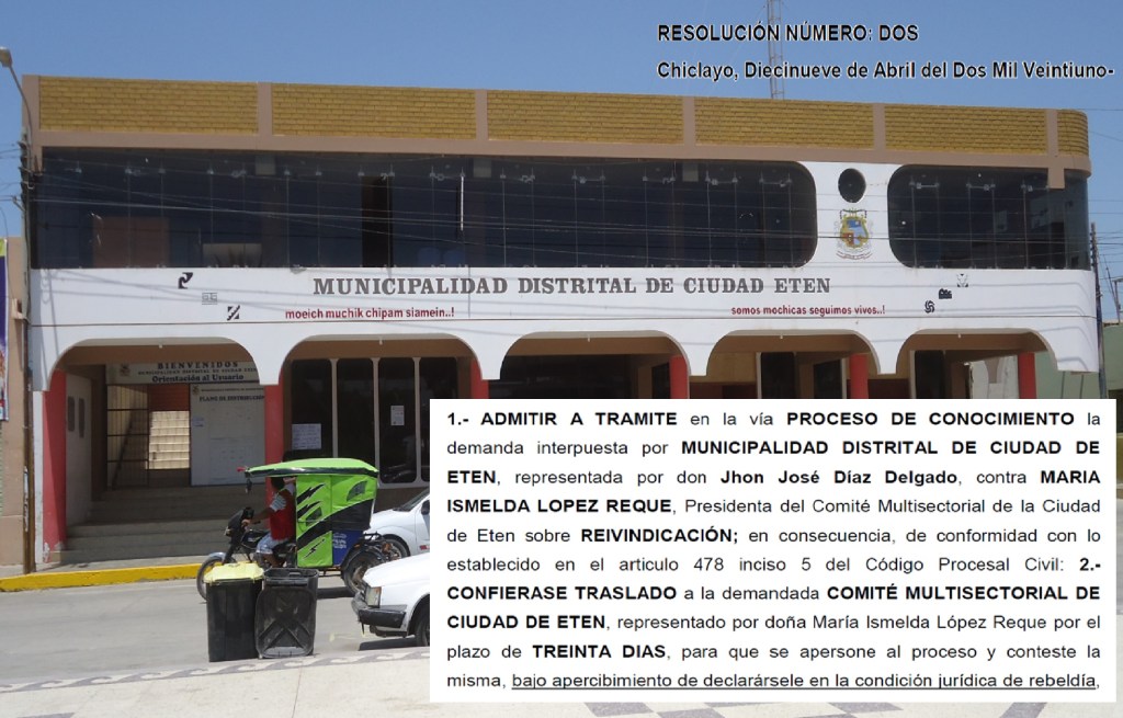 El proceso de Reivindicación, se inició el 2021 en el Sétimo Juzgado, con la jueza Liza Karina Fabián Palomino. La Municipalidad de Eten demandó al comité multisectorial, representado por María Ismelda López Reque. Pidió se disponga la restitución del predio donde está la capilla por ser el propietario del inmueble. El comité alegaba que se encuentra en posesión. La presidenta del comité, Ismelda López no se apersonó al proceso. Una resolución judicial la declaró rebelde y otra señaló que no se admitía medio probatorio alguno de la parte demandada y tener la condición jurídica de rebelde.