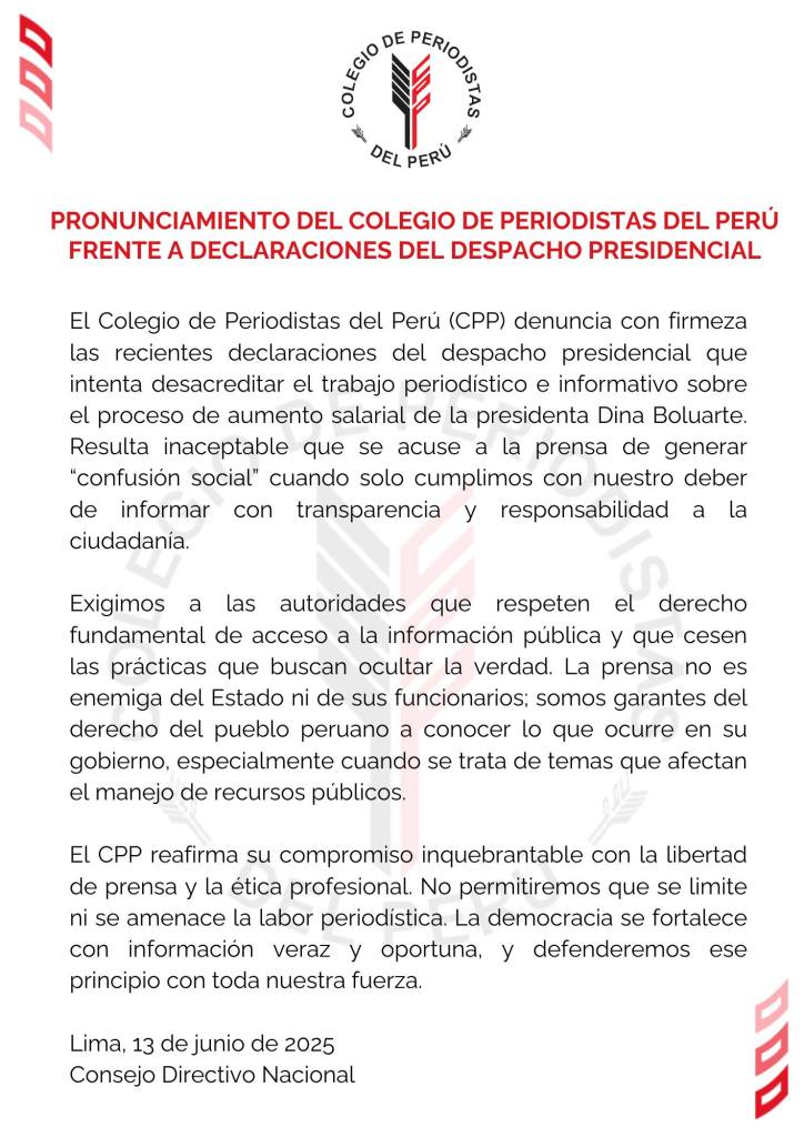 «Rechazamos enérgicamente las declaraciones del Despacho Presidencial que buscan desacreditar el trabajo periodístico sobre el aumento salarial de la presidenta Dina Boluarte”. Así se pronunció el Colegio de Periodistas del Perú, al señalar que informar no es un delito. “La prensa no genera ‘confusión social’, ejerce su deber con transparencia y responsabilidad”, se dijo.