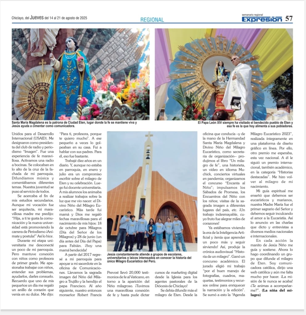 A partir de entonces, mi vida fue consagrada a ese milagro divino ocurrido en 1649 en Ciudad Eten y que tanto promovió nuestro amado Papa León XIV, cuando fue obispo de la Diócesis de Chiclayo. Recuerdo que de pequeñita representaba en desfiles al niño Jesús con vestidito morado, mi cabello rizado natural y en la mano una hostia de cartón. Al comienzo no entendía por qué. Conforme fui creciendo me fascinó conocer más la historia del único milagro eucarístico del Perú.