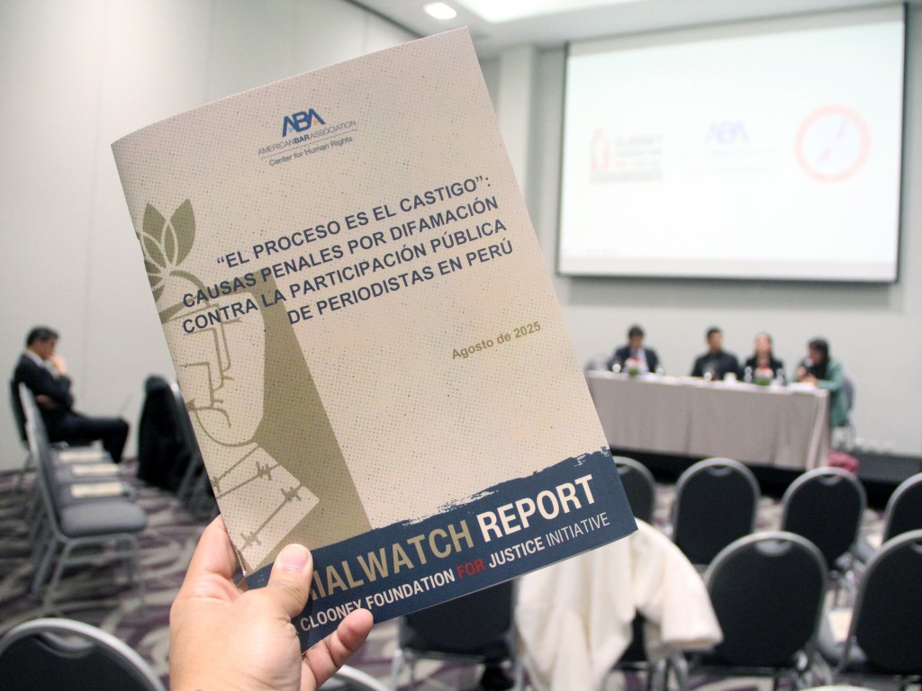 La Asociación Nacional de Periodistas del Perú (ANP) acompañó activamente la presentación oficial del informe “El proceso es el castigo: causas penales por difamación contra la participación pública de periodistas en Perú”, elaborado por la American Bar Association (ABA) y la Clooney Foundation For Justice (Fundación Clooney) con el apoyo del gremio.