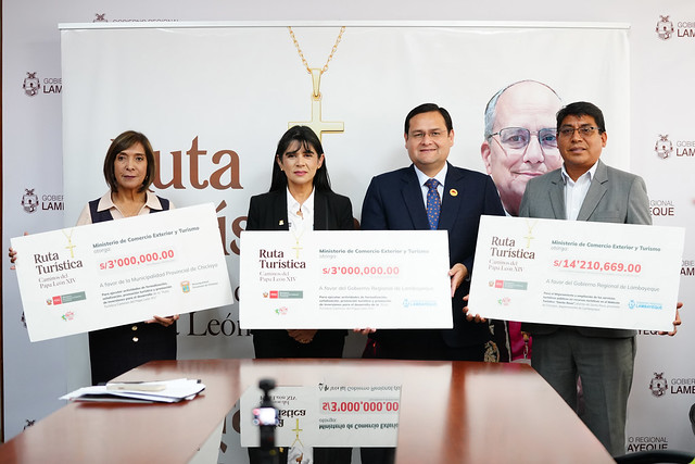 Los convenios con el Gobierno Regional (GORE) de Lambayeque y la Municipalidad Provincial de Chiclayo permitirán financiar actividades de formalización, señalización, promoción de la oferta turística y atracción de inversiones privadas vinculadas al desarrollo de la Ruta Turística “Caminos del Papa León XIV”.