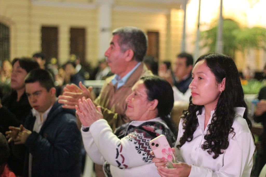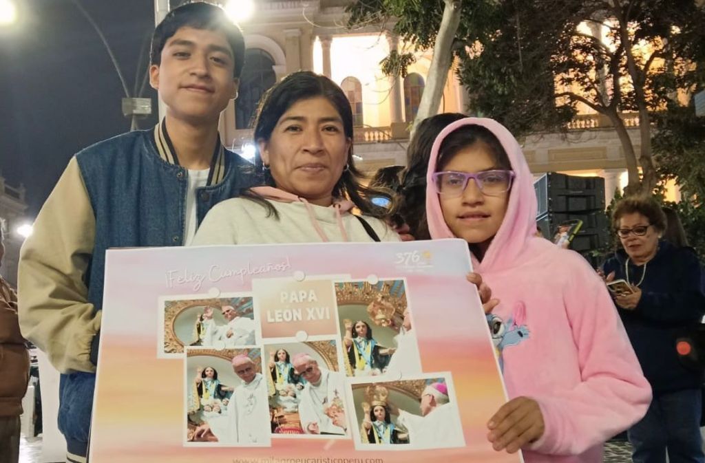 El grupo Milagro Eucarístico Perú 1649 llevó —a la serenata organizada por la Municipalidad Provincial de Chiclayo— un cartel de saludo al Papa León XIV con un collage de fotos del 2 de junio de 2019 cuando coronó al Niño del Milagro. Niños, jóvenes, familia, enfermeras, policías posaron felices con el cartel en señal de amor y oración por el Santo Padre.