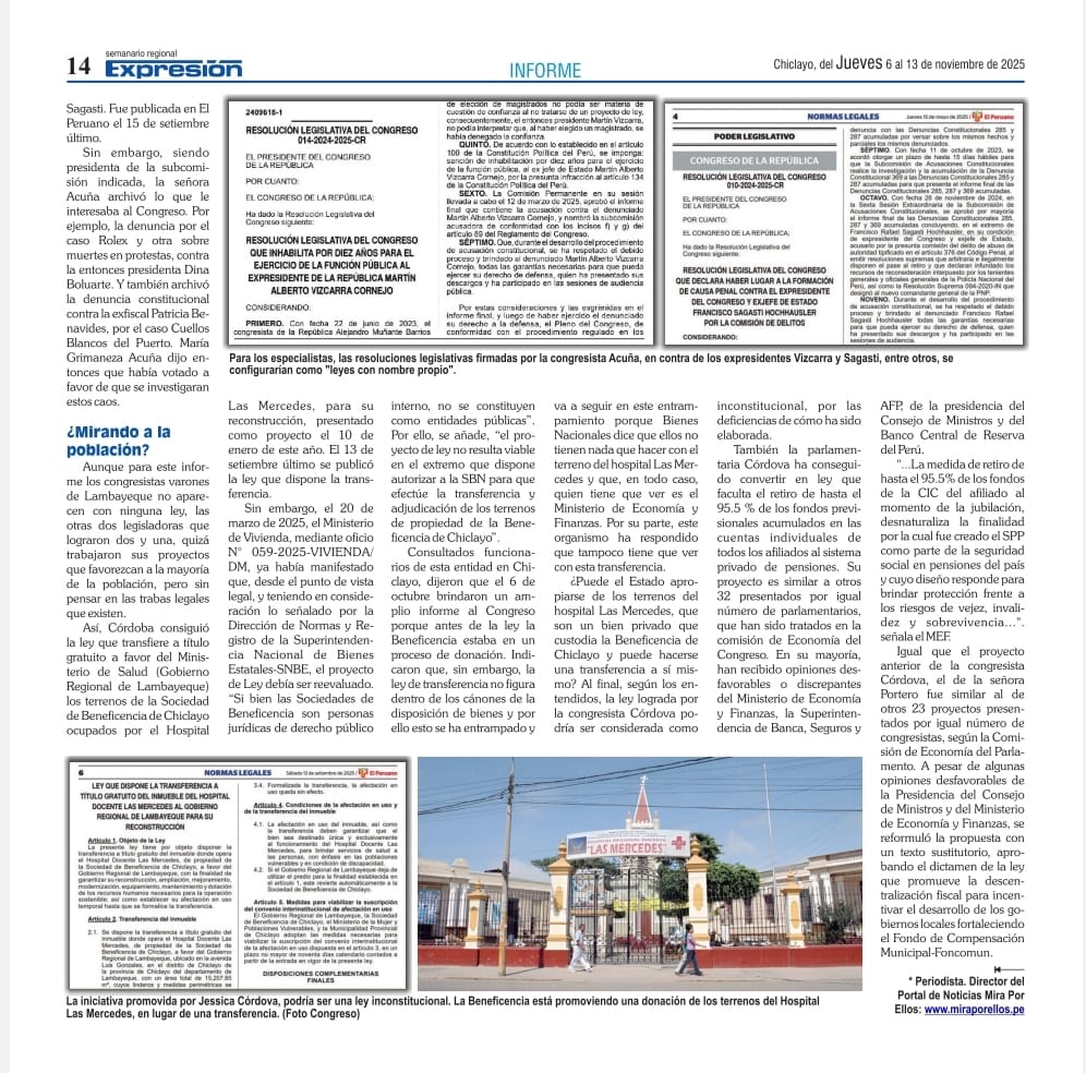 El semanario Expresión, de Chiclayo, publicó este jueves 6 de noviembre, en tres páginas, el informe de investigación de Mira Por Ellos, sobre los cinco congresistas lambayecanos.