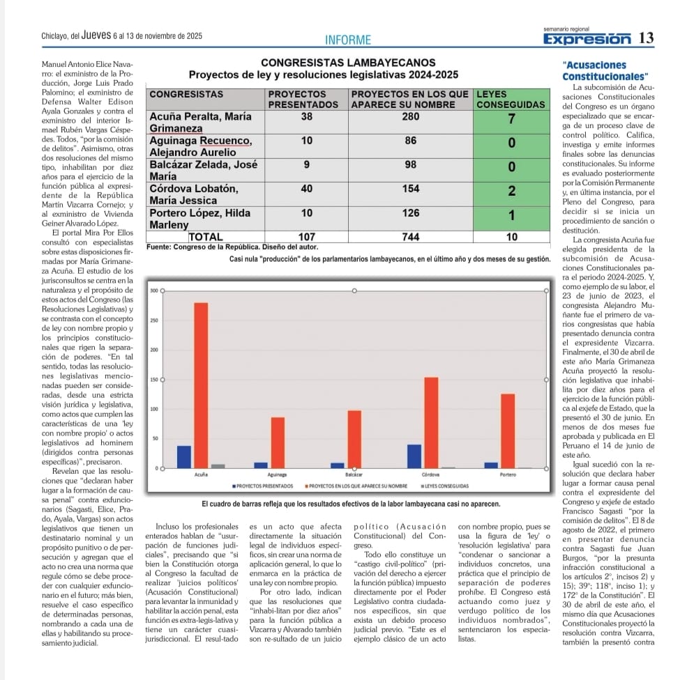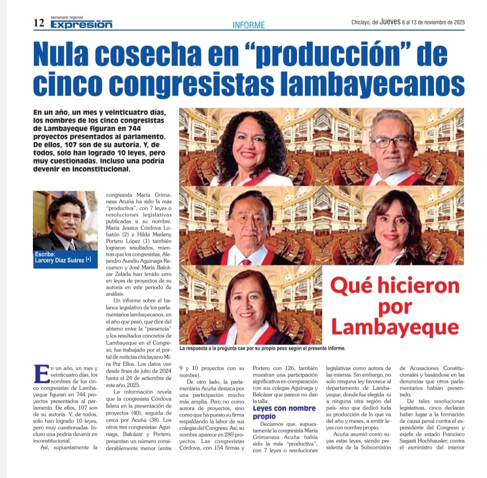 Un informe sobre el balance legislativo de los parlamentarios lambayecanos, en el año que pasó, que dice del abismo entre la “presencia” y los resultados concretos de Lambayeque en el Congreso, fue trabajado por el portal de noticias chiclayano Mira Por Ellos. Los datos van desde fines de julio de 2024 hasta el 24 de setiembre de este año, 2025.