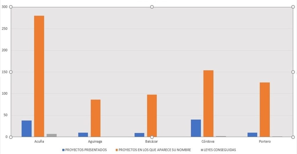 La información revela que la congresista Córdova lidera en la presentación de proyectos (40), seguida de cerca por Acuña (38). Los otros tres congresistas: Aguinaga, Balcázar y Portero, presentan un número considerablemente menor (entre 9 y 10 proyectos con su nombre).