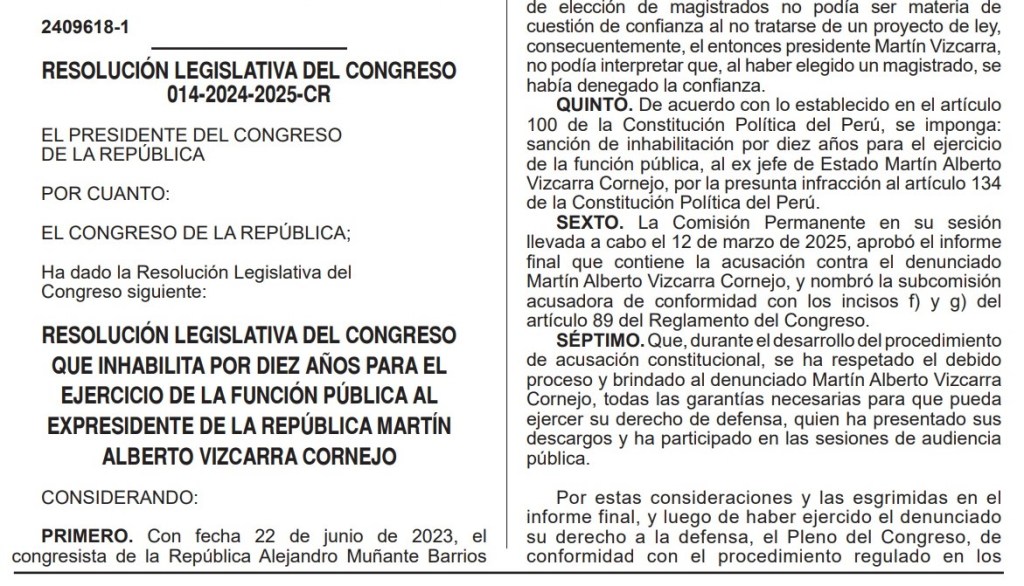 Por otro lado, indican que las resoluciones que “inhabilitan por diez años” para la función pública a Vizcarra y Alvarado también son resultado de un juicio político (Acusación Constitucional) del Congreso.
