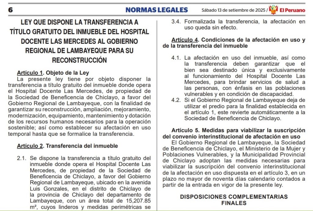 Así, Córdoba consiguió la ley que transfiere a título gratuito a favor del Ministerio de Salud (Gobierno Regional de Lambayeque) los terrenos de la Sociedad de Beneficencia de Chiclayo ocupados por el Hospital Las Mercedes, para su reconstrucción, presentado como proyecto el 10 de enero de este año. El 13 de setiembre último se publicó la ley que dispone la transferencia.